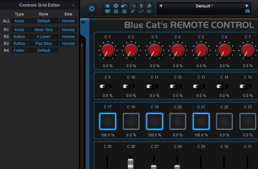 With Blue Cat's Remote Control, you can choose any type of control (switches, faders, joysticks, knobs) or meter, assign a MIDI chanel and message to each control, customize its response curve. You can as well choose a built-in skin that suits your needs for every instance of the plug-in, or use the dynamic grid skin to generate the most approrpriate layout for you. You can even create your own skin (see the Skins section): this is the best way to create your own user interface to control your entire Digital Audio Workstation (DAW) and external hardware the way you have chosen.