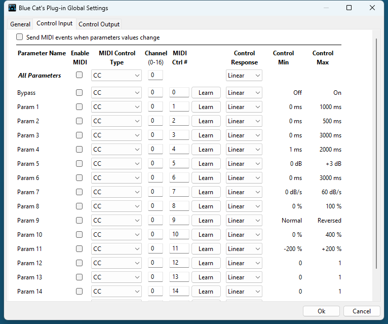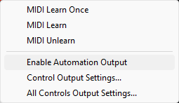 "Send MIDI events when parameters values change": activate this option when using a control surface that accepts MIDI events as input. MIDI messages will be sent to the output of the plug-in when the user change the parameters values in the user interface, to keep the software and the controller in sync. MIDI is only sent for parameters that are activated for MIDI control.