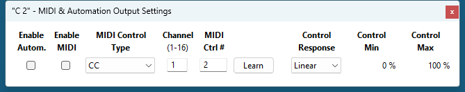 The plug-in offers a couple of settings that affect the way it is controlled by MIDI messages or automation. While the first settings only apply to MIDI control, the "Control Response", "Min" and "Max" settings apply to both automation and MIDI control.