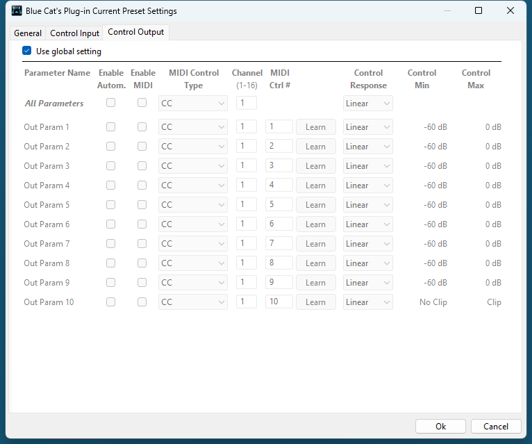 You can set the same properties for the output parameters as for the input parameters: in this case, they may trigger MIDI CC messages or generate automation curves when modified. Since it's output, you cannot set the channel to MIDI Omni, so you must choose a channel.