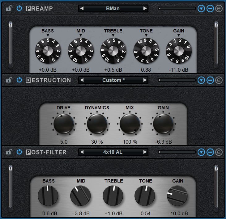 This of course applies to full amp presets, although for bass you will probably find more occurrences in the PREAMP and POST FILTER (cabinets) sections to build your own tone from individual parts of the processing chain.