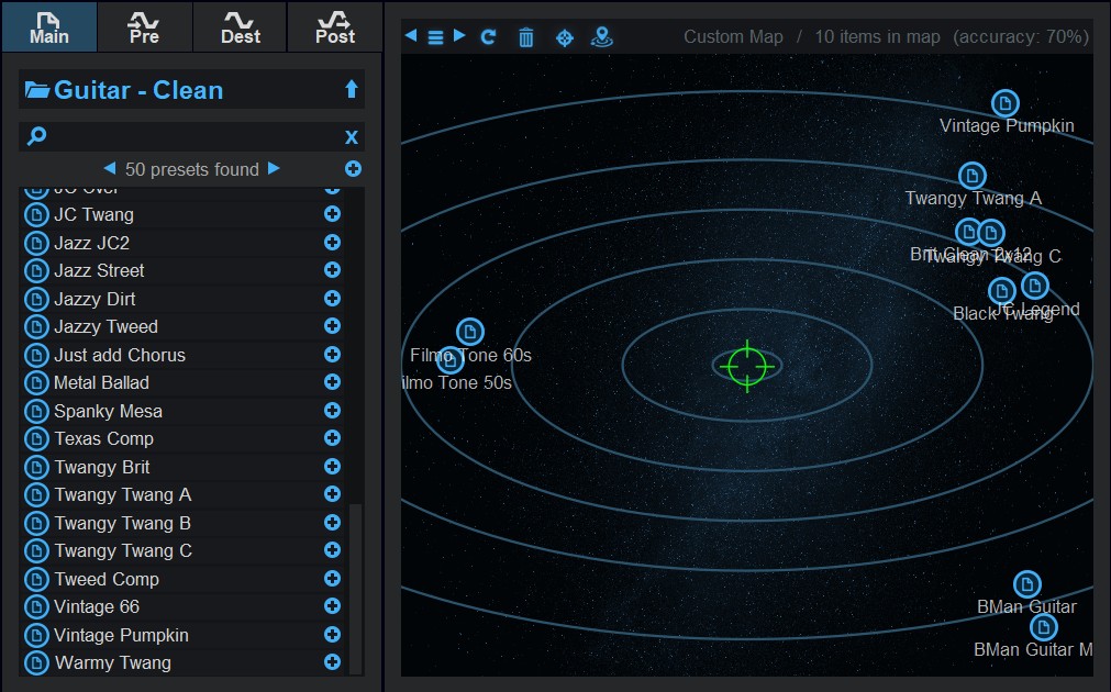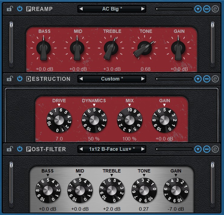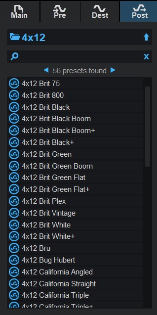 This of course applies to full amp presets but also to PREAMP and POST FILTER (cabinets), if you are building your own tone from individual parts of the processing chain: