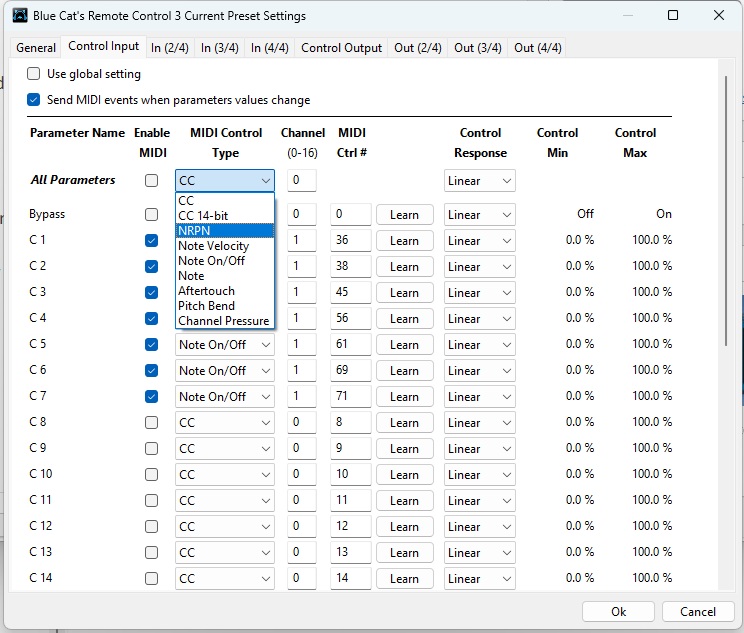 The MIDI capabilities of the remote control have also been fully redesigned. The plug-in can now use multiple types of MIDI events in addition to the existing MIDI CC messages (14-bit CC, NRPN, various MIDI Note events, Aftertouch, Channel Pressure, Pitch Bend…), both as input or output.