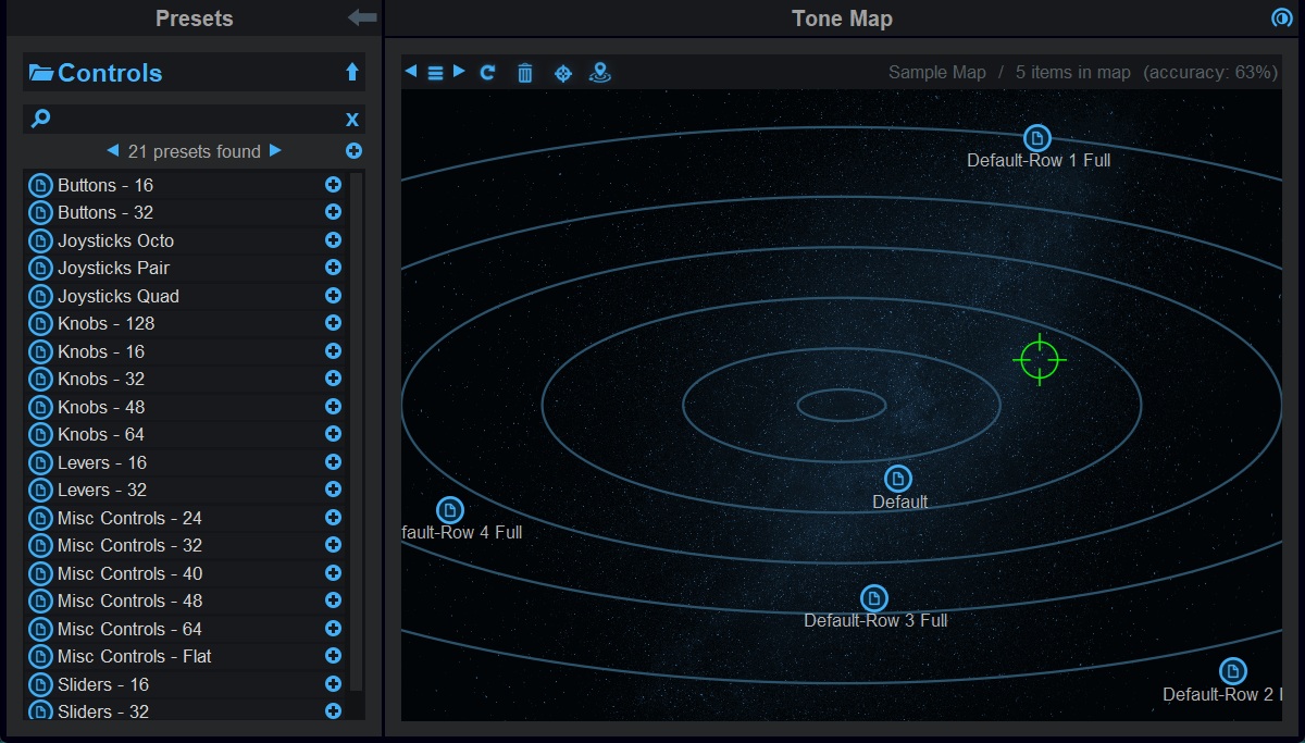 Create your presets for the systems that you want to control with the Remote Control, and load them into a tone map. You can now explore areas in between your presets and morph between them to create new tones. Parameter changes are sent to the device(s) via MIDI.