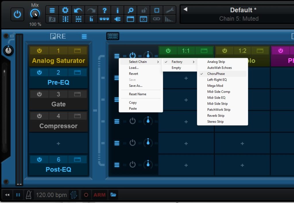 You can now copy/paste and save/reload your favorite effects chains between PRE, PARALLEL or POST chains, and even share them with our other plug-in hosts (MB-7 Mixer, Axiom, Fader Hub, Late Replies). PatchWork will automatically adjust its matrix width and height to insert the plug-ins.