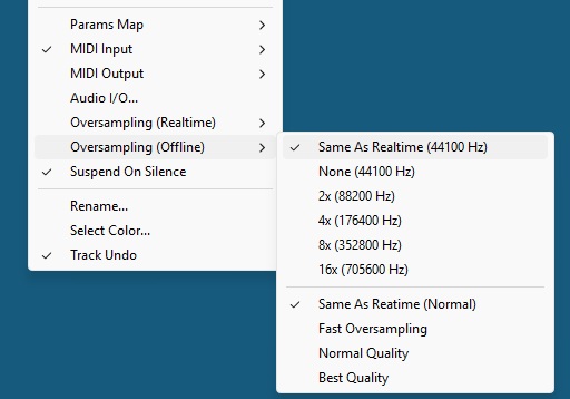Still an experimental feature (as some hosts might have some problems with latency changes upon render, although “major” ones seem to behave properly so far), you can now select different plug-in oversampling options for real-time and offline rendering.