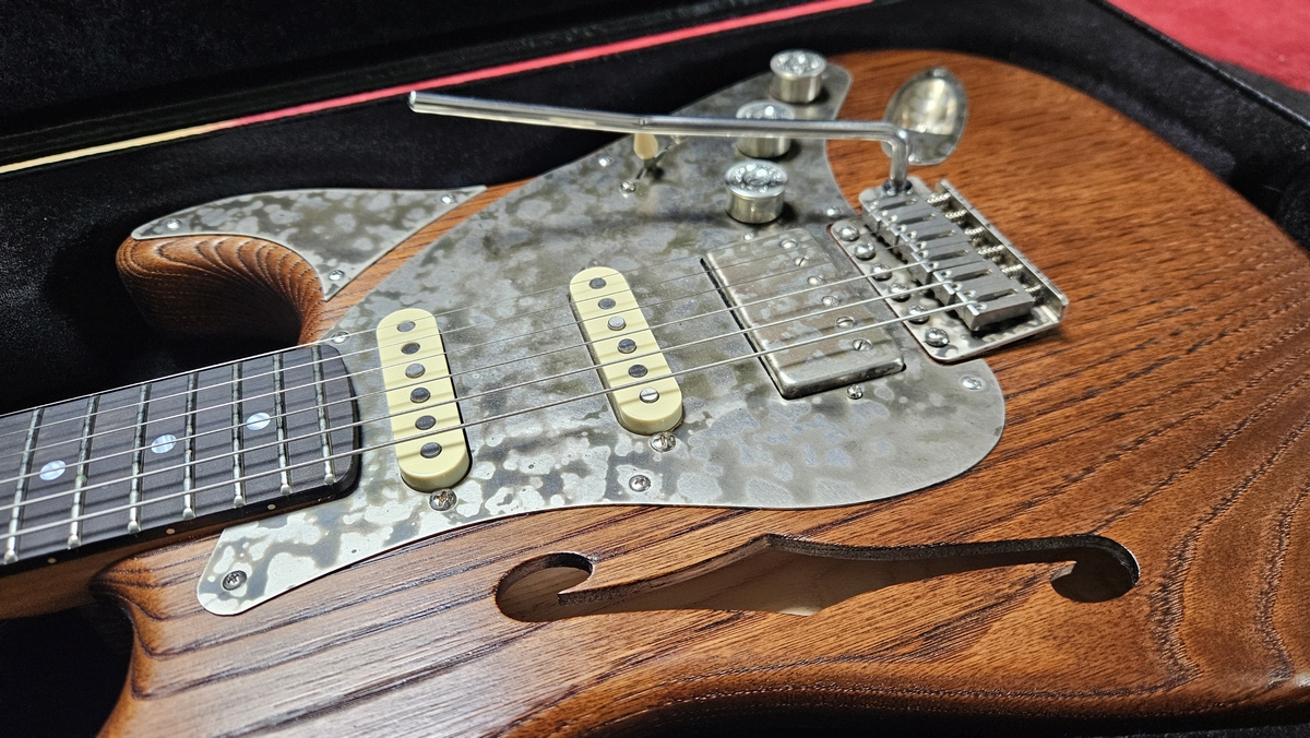 This particular model is a sort of “Super Strat”: a natural color Lounge Alfa HSS model with reverse headstock (The Alfa shape was formerly known as “Stratospheric”).