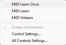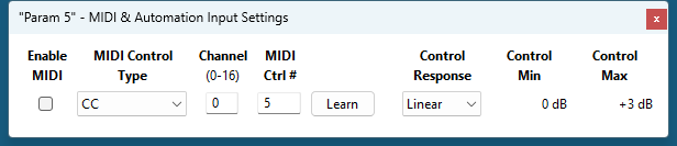 The plug-in offers a couple of settings that affect the way it is controlled by MIDI messages or automation. While the first settings only apply to MIDI control, the "Control Response", "Min" and "Max" settings apply to both automation and MIDI control.