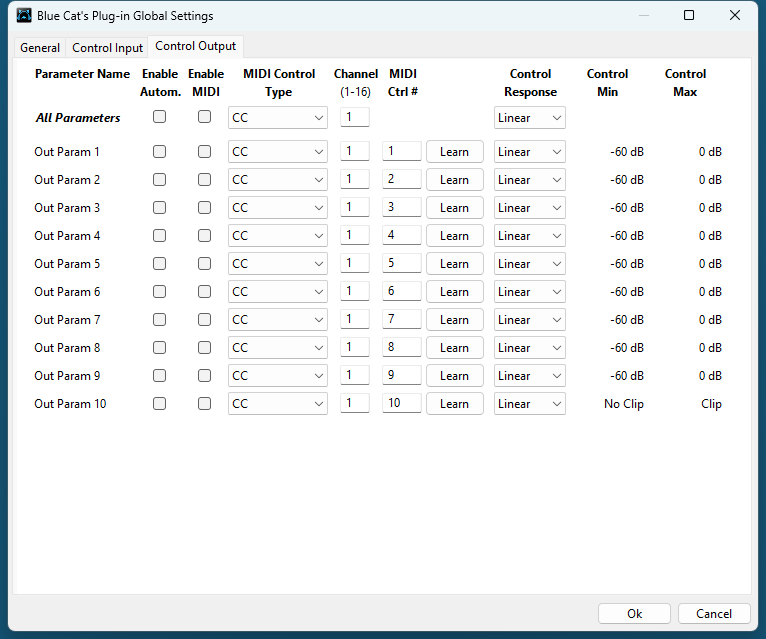 You can set the same properties for the output parameters as for the input parameters: in this case, they may trigger MIDI CC messages or generate automation curves when modified. Since it's output, you cannot set the channel to MIDI Omni, so you must choose a channel.
