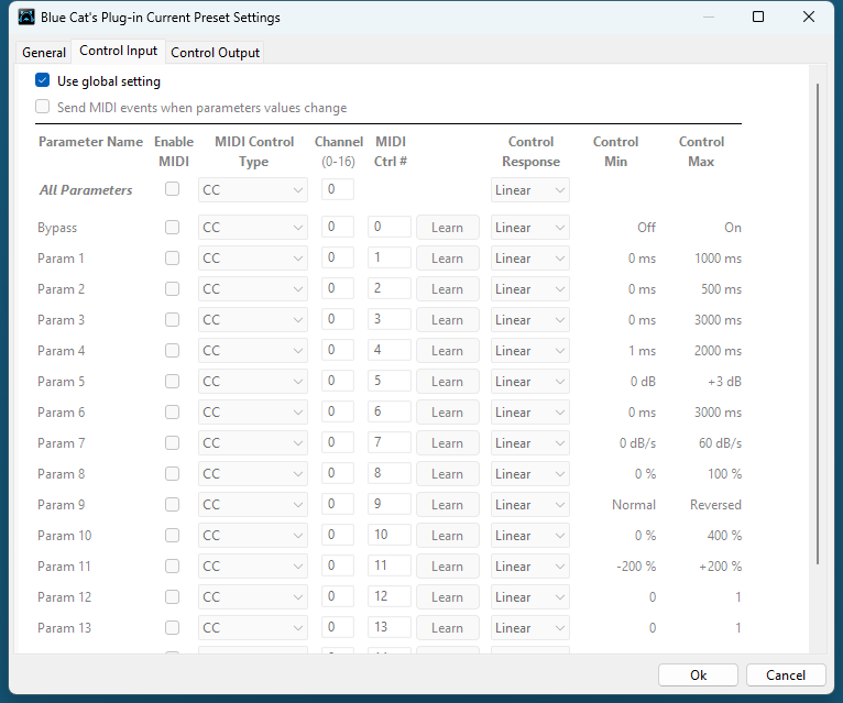 In addition to the controls offered in the main user interface, Blue Cat's Remote Control has various settings that let you fine tune the behavior of the plug-in. You can choose to change these settings either for the current preset or globally for all instances of the plug-in.
