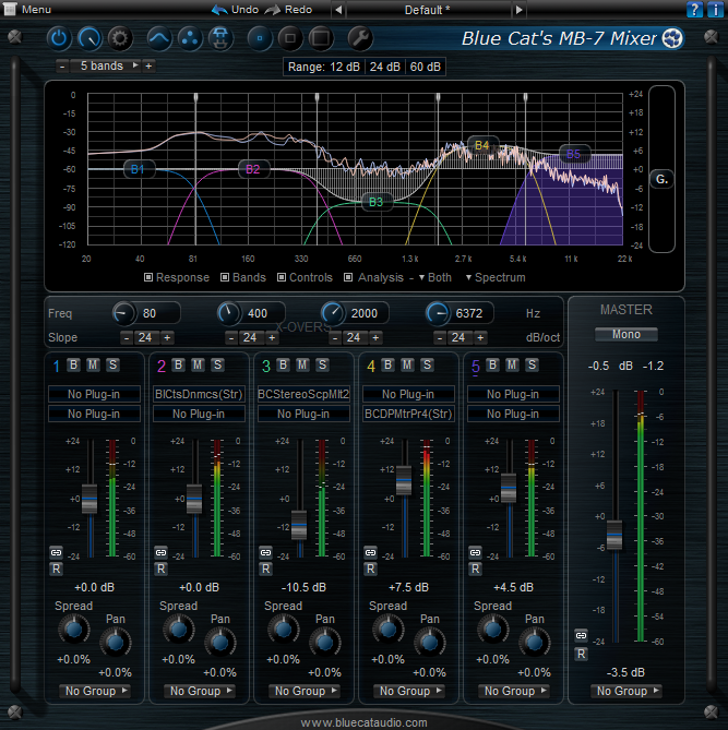 Blue Cat's MB-7 Mixer is a unique plug-in that splits the signal into several frequency bands and lets you mix and process them as if they were separate tracks. In addition to the ability to host up to 4 VST plug-ins per band and thus transform any regular plug-in into a frequency-aware processor, Blue Cat's MB-7 Mixer has now a brand new modular user interface, with lots of new features and enhancements: a spectrogram display, a new presets manager, multiple display sizes, new MIDI and automation mapping capabilities, and more (full list below).